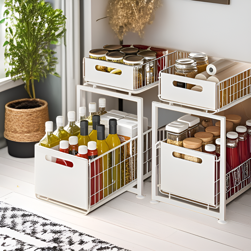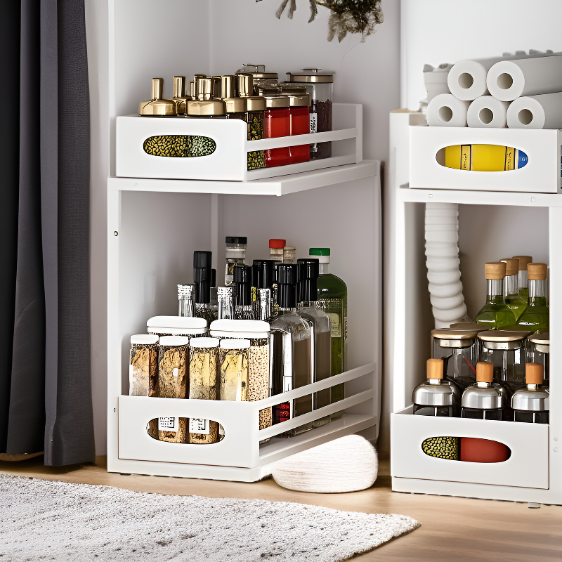 ● ชั้นวางของสองชั้นใต้อ่างล้างจาน ปรับขนาดได้ตามต้องการ ช่วยจัดระเบียบพื้นที่ใต้ซิงค์ให้เป็นระเบียบมากขึ้น ไม่เกะกะ